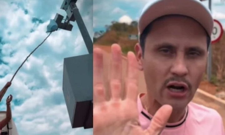 aparece tapando com uma camiseta um radar de registro de excesso de velocidade.