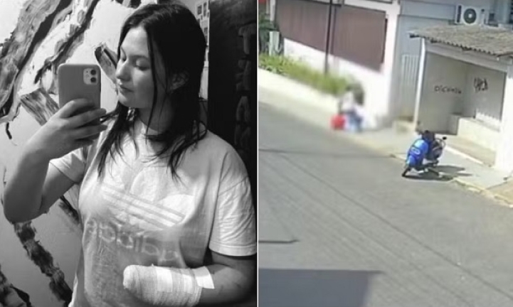 ela está caída no chão. Depois do ataque, ele foge de moto.